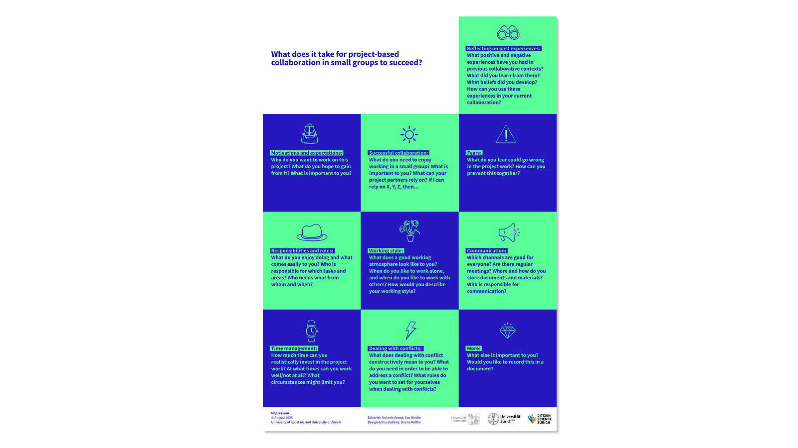 What does it take for project-based collaboration in small groups to succeed? Based on our experience with various teaching formats, we have compiled a compact collection of questions. It covers the most important topics for determining how collaboration should be structured right from the start of a project.